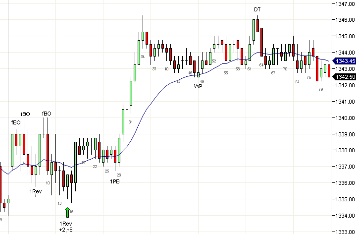 There are many kinds of 1Rev. A reversal after the first successful scalp trade or at least a 6 tick move from the close of the previous bar is a type of 1Rev (b7). A reversal after a trend move however, is usually the best kind of 1Rev and is often the low or high of the day. A reversal bar after a large gap can be considered to be a first reversal since the large gap represents a trend move.